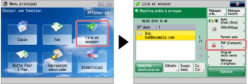 Si le format de fichier sélectionné est PDF (OCR) ou XPS (OCR), et que <Lecture avancée> est réglé sur "Oui" sous Réglages OCR (recherche texte possible), la machine détecte l'orientation de l'original et, si nécessaire, fait pivoter le document avant de l'envoyer. (Voir "Réglages pour la création de fichier PDF permettant la recherche de texte".)