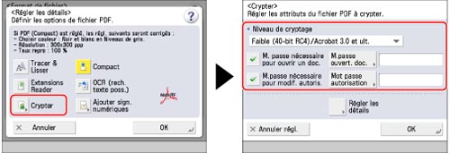 Si [M.passe nécessaire pour modif. autoris.] est activé, la saisie d'un mot de passe est obligatoire pour imprimer ou modifier les fichiers PDF cryptés qui ont été reçus.
