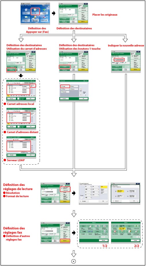Pour définir des fonctions de fax utiles, telles que l'envoi simultané d'originaux de formats différents ou l'envoi d'originaux recto verso.