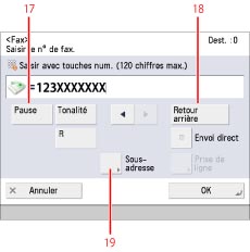 S'affiche en cas de définition de plusieurs lignes. Appuyer pour définir la sous-adresse et le mot de passe, ou pour sélectionner la ligne téléphonique à utiliser pour la transmission.