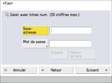 Appuyer sur [Régler détails] → saisir [Sous-adresse], [Mot de passe] → appuyer sur [Suivant].