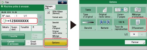 Spécifier les destinataires → appuyer sur [Options] → [Effacement].