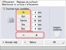 Appuyer sur [Centre] et [Côtés] → appuyer sur [-] ou [+] pour définir leur largeur d'effacement respective.