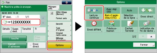 Le nombre maximal de pages pouvant être envoyées en une seule fois est de 999. En mode Lecture continue, un message demandant si la tâche doit être envoyée s'affiche après la lecture des 999 premières pages. Si l'on décide d'envoyer la tâche, les 999 pages lues sont envoyées. Si la tâche est annulée, les pages lues ne sont pas envoyées.