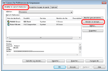 Il est également possible de modifier les données de groupes destinataires précédemment enregistrés. Pour plus d'informations, cliquer sur [Aide] dans l'angle inférieur droit de la fenêtre du pilote de télécopie pour afficher l'aide en ligne.