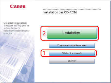 L'écran du menu du User Software CD-ROM permet de lancer l'installation du pilote du scanner (Color Network ScanGear/Network ScanGear) ou d'afficher le Guide d'installation du Network ScanGear.