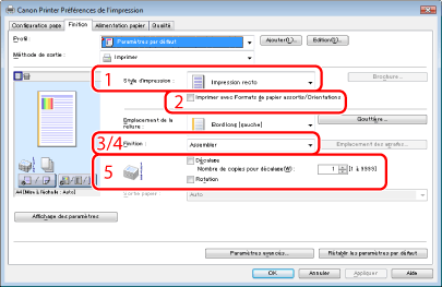 Pour imprimer au recto des pages uniquement ou au recto verso. [Style d'impression] a pour valeur par défaut [Impression recto verso] (voir "Impression recto et recto verso").