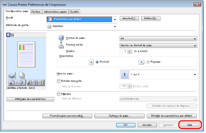 Pour afficher l'aide en ligne, cliquer sur le bouton [Aide] de l'écran du pilote d'imprimante.