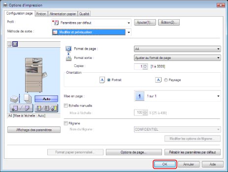 Définir les réglages d'impression à chaque écran de la boîte de dialogue du pilote d'imprimante → cliquer sur [OK].
