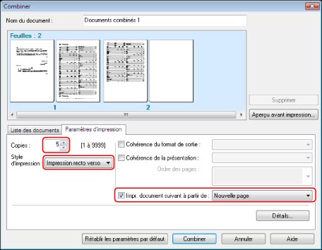 Pour enchaîner avec limpression du document suivant lorsquun document comporte un nombre impair de pages, sélectionner [Impr. document suivant à partir de] → [Nouvelle page].