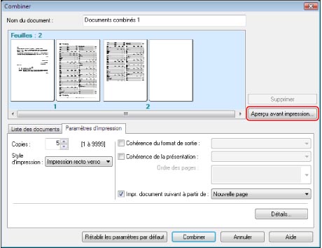 L'aperçu est affiché. Consulter l'aperçu → cliquer sur [Fermer] pour revenir à la boîte de dialogue [Combiner].