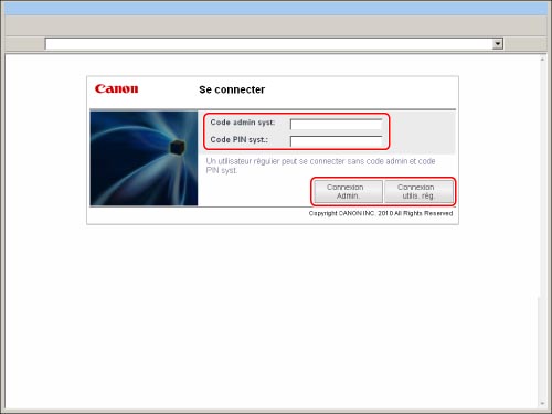L'écran suivant affiche le réglage par défaut. Saisir le numéro de service et le code PIN → cliquer sur [Connexion Admin.]. Le réglage par défaut du numéro d'administrateur système et du mot de passe système est "7654321". Il est recommandé de changer à la fois le numéro d'administrateur système et le mot de passe système.
