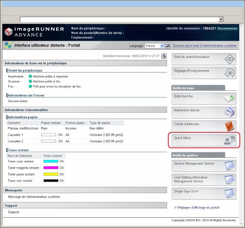 Il est possible d'utiliser les fichiers importés entre les mêmes modèles (Machine imageRUNNER ADVANCE C2030L/C2020L). Il se peut toutefois que l'on ne puisse pas utiliser certains des boutons importés si les machines ne sont pas équipées des mêmes périphériques en option et en fonction de l'environnement d'utilisation.