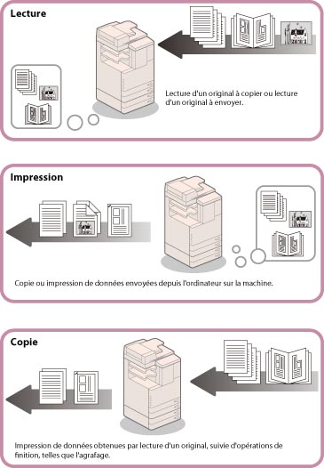 Pour éviter toute confusion lors de la lecture de ce guide (Manuel électronique), les expressions "lecture", "impression" et "copie" sont définies ci-dessous. Pour les opérations de copie, la lecture de l'original et l'impression de la copie peuvent être décrites séparément.