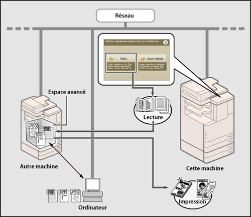 Pour plus d'information sur les espaces avancés, voir les manuels utilisateur d'autres machines de la série imageRUNNER ADVANCE avec espaces avancés.