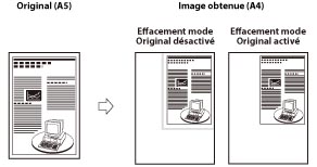 Ce mode permet d'effacer les bordures et contours noirs qui apparaissent sur le pourtour de l'image lue lorsque l'original est plus petit que le format d'enregistrement sélectionné. Il peut aussi servir à créer une bordure blanche sur le pourtour de l'image lue.