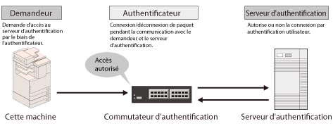 Gère toutes les informations d'authentification par l'intermédiaire du serveur d'authentification (RADIUS : Remote Authentication Dial In User Service, Service utilisateur entrant d'authentification à distance) et authentifie le requérant. Il est possible d'interdire un accès non autorisé parce que seul le demandeur authentifié par le serveur RADIUS est autorisé à se connecter au réseau par l'authentificateur.