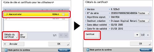 Sélectionner la biclé du certificat utilisateur à confirmer → appuyer sur [Détails du certificat] → [Certificat].