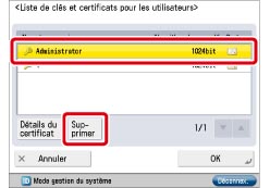 Pour plus d'informations sur la manière dont un simple utilisateur peut afficher le certificat utilisateur, voir "Vérification d'une signature de périphérique/d'un certificat de signature utilisateur". Toutefois, dans ce cas, seul le certificat de l'utilisateur actuellement connecté apparaît. Les certificats des autres utilisateurs ne peuvent pas être affichés. Le certificat de l'utilisateur ne peut pas non plus être supprimé dans cet écran. Un utilisateur doit utiliser l'interface distante pour supprimer son certificat. (Voir "Installation d'un fichier de certificat".)