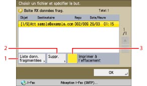 Si des fichiers d'image joints aux documents I-fax reçus ne sont pas compatibles avec cette machine, celle-ci n'effectue pas les opérations prévues (impression, transfert ou mise en mémoire), et les fichiers sont supprimés. Dans ce cas, les noms des fichiers supprimés et un message signalant que l'image n'a pas pu être créée sont imprimés avec le texte du message de l'I-Fax reçu.