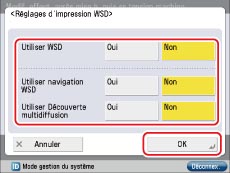 Pour utiliser l'application d'impression WSD (Web Services on Devices), appuyer sur [Oui] pour <Utiliser WSD>. [Utiliser HTTP] est automatiquement réglé sur "Oui" si [Oui] est sélectionné.