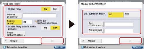 Pour utiliser la fonction d'authentification proxy, appuyer sur [Régler authentification] → appuyer sur [Oui] pour <Util. authentif. Proxy>. Appuyer sur [Nom d'utilisateur] → saisir le nom d'utilisateur à utiliser pour l'authentification proxy → appuyer sur [OK]. Appuyer sur [Mot de passe] → saisir le mot de passe à utiliser pour l'authentification proxy → appuyer sur [OK]. Dans l'écran de confirmation, entrer le même mot de passe pour le confirmer → appuyer sur [OK].