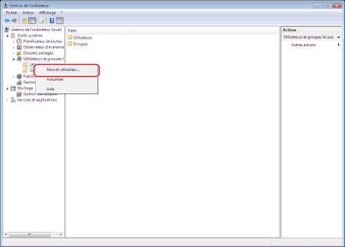 Cliquer avec le bouton droit sur le dossier [Utilisateurs] → sélectionner [Nouvel utilisateur] dans le menu contextuel.