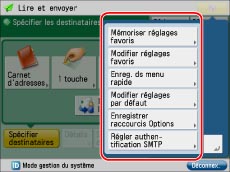 [Régler authentification SMTP] ne s'affiche que sur l'écran de fonction [Lire et envoyer]. Pour plus d'informations sur le réglage de l'authentification SMTP, voir "Utilisation de l'authentification SMTP pour chaque utilisateur".