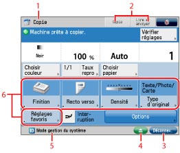 L'état d'avancement des tâches et des opérations de copie ainsi que le statut des périphériques et des consommables s'affichent ici. En fonction du service de connexion que l'on définit, le numéro du service ou le nom utilisateur peut également s'afficher.