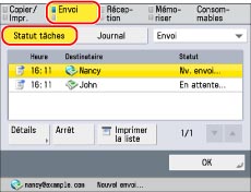 Le rapport Envoyer liste des tâches comprend une liste des transmissions de type télécopie, e-mail, I-Fax et serveur de fichiers.