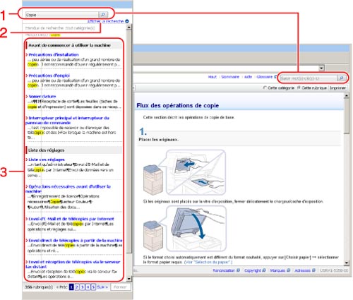 Saisir un mot-clé dans le champ de saisie situé dans le coin supérieur droit de la page d'accueil ou de la page de rubrique, puis cliquer sur pour afficher la boîte de dialogue de recherche.Il est également possible de rechercher un mot-clé dans la boîte de dialogue affichée. En outre, une recherche avec l'opérateur logique AND (ET) est possible dans le Manuel électronique, afin d'affiner les résultats de la recherche en saisissant deux mots-clés ou plus. Lors de la saisie de mots-clés, insérer un espace entre les mots-clés. Exemple : "Message Toner" (si l'on souhaite afficher les pages contenant les mots "Toner" et "Message" |