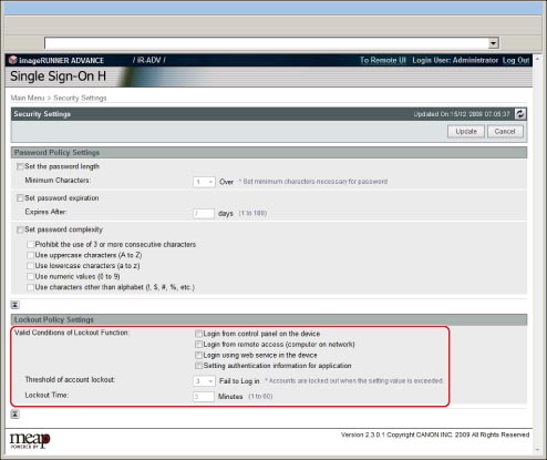 Lorsque la fonction de blocage est définie pour SSO-H, il est possible de définir la durée après laquelle le service de connexion s'arrête pour un utilisateur.