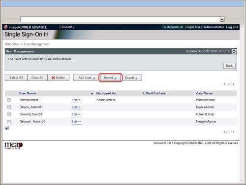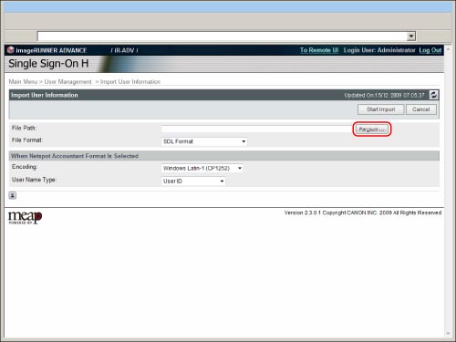 Importer les données utilisateur créées dans le format de fichier utilisé pour SDL et le système Local Device Authentication de SSO-H (extension de fichier : "ldif").