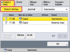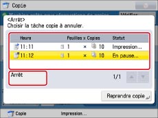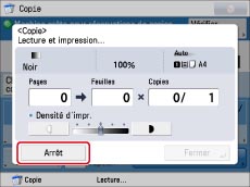 Si l'on appuie sur [Arrêt] dans l'écran qui apparaît pendant la copie ou en mode d'attente, il est possible d'annuler la tâche en cours de copie, ou la dernière tâche pour laquelle un original a été lu et qui est en attente de copie.
