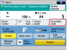 [Echantillon copie] apparaît uniquement si plusieurs copies de l'original doivent être effectuées en mode Tri séquentiel (Ordre pages), Décalage, Rotation de 90 degrés, Agrafage, Ajouter couverture, Insérer feuilles ou Intercalaires pour transparents.