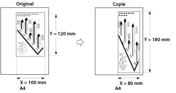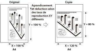 Il est possible de choisir le taux de réduction ou d'agrandissement des originaux par pas de 1 %. Le même taux de reproduction est utilisé pour l'axe horizontal et l'axe vertical.