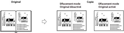 Ce mode permet d'effacer le pourtour foncé et la ligne médiane qui apparaissent lors de la copie de pages en vis-à-vis d'un livre ou d'un original relié sur une seule feuille de papier.