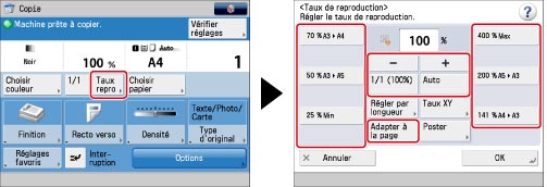 Si [Auto] est activé, sélectionner un format papier manuellement. Si l'on ne sélectionne pas le format papier, le taux de reproduction est automatiquement défini en fonction de celui qui est chargé dans la cassette n° 1.