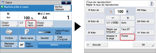 Il est possible de faire des posters avec des taux de reproduction différents de ceux indiqués dans le tableau "Calcul du taux de reproduction et du nombre de pages". Néanmoins, le format de l'original ne doit pas être supérieur au format A3 et le taux de reproduction ne doit pas dépasser 400 %.
