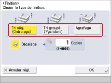 Si l'option [Tri séquentiel auto.] est réglée sur "Oui", le mode Tri séquentiel ou Tri séquentiel décalé est automatiquement activé lorsque les originaux sont mis en place dans le chargeur. (Voir "Activation du tri séquentiel automatique".)