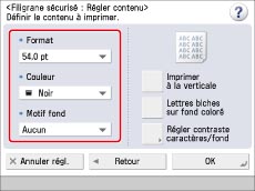 Le réglage [Régler contraste caractères/fond] est annulé à la fin de la tâche. Pour utiliser les mêmes réglages pour le tirage suivant, spécifier à nouveau le réglage.