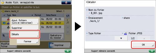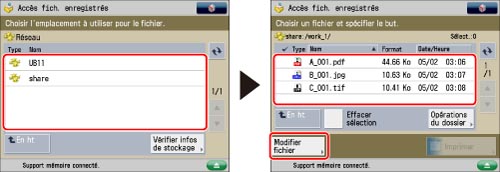 Sélectionner l'espace mémoire souhaité → sélectionner l'emplacement où le fichier sera mémorisé → appuyer sur [Modifier fichier].