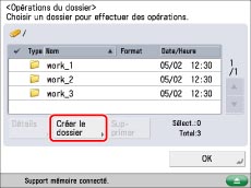 Sélectionner le support mémoire souhaité → sélectionner le niveau de dossier souhaité → appuyer sur [Opérations du dossier].