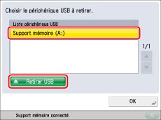 Sélectionner le support mémoire à retirer → appuyer sur [Retirer USB].