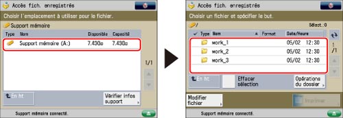 Sélectionner le support mémoire souhaité → sélectionner l'emplacement où le fichier à imprimer est enregistré.