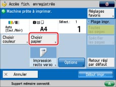 Si l'option [Mémoriser régl. par défaut plat. multifctns] est réglée sur "Oui" dans les réglages d'utilisation du périphérique, et que les format et type de papier ont été mémorisés, ces informations sont affichées à l'écran pour le papier sélectionné. (Voir "Mémorisation des réglages par défaut du plateau multifonctions".)