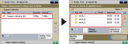 Sélectionner le support mémoire souhaité → sélectionner l'emplacement où le fichier à imprimer est enregistré.