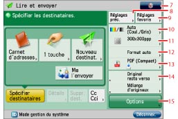 Pour sélectionner et utiliser d'autres modes de lecture et d'envoi disponibles. Pour définir des fonctions d'envoi utiles, telles que l'envoi simultané d'originaux de formats différents ou l'envoi d'originaux recto verso.