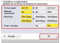 Définir les conditions de réception en fonction des spécifications de la machine du destinataire. Une erreur de transmission peut survenir si les conditions définies ne sont pas prises en charge par la machine du destinataire.