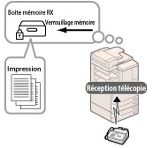 Il est possible de régler la machine pour qu'elle enregistre les documents reçus par fax dans la boîte mémoire RX sans les imprimer. Les informations concernant l'émetteur et le nombre de pages de chaque document peuvent être consultées avant l'impression ou le transfert à un autre destinataire.